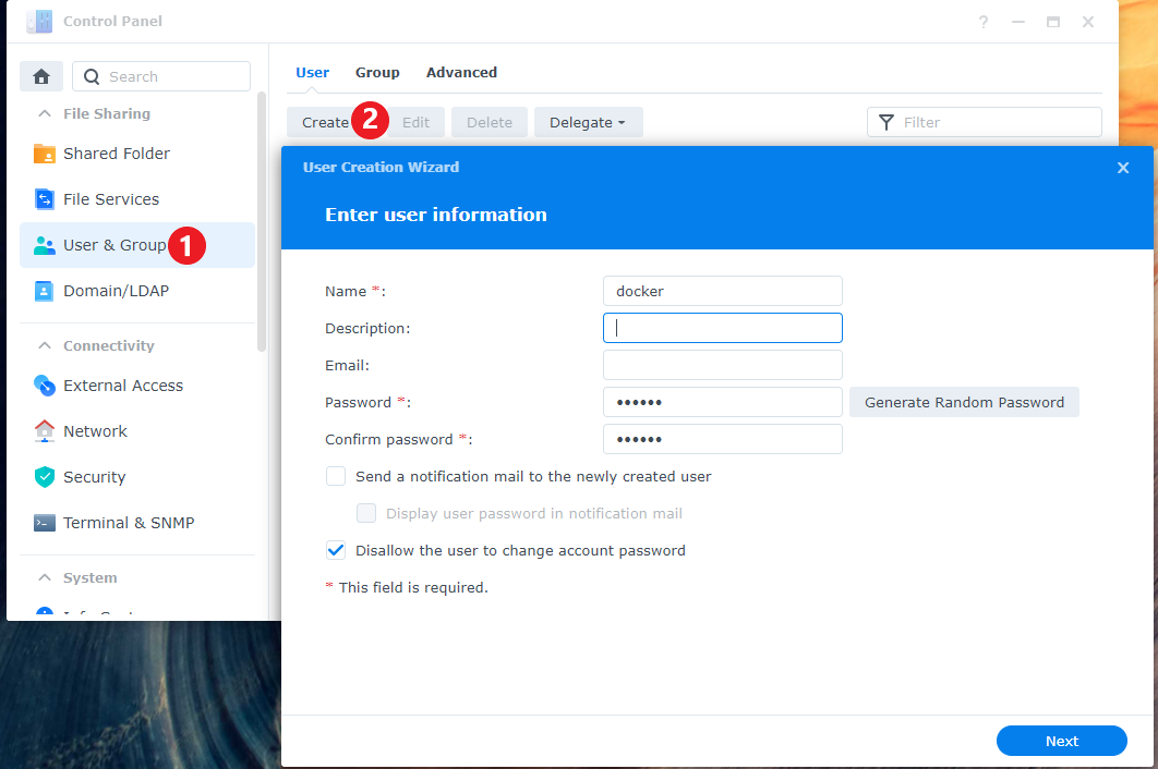 We are going to create a new user that only has access to the share(s) that we use for the containers to run. You should not have the containers run as an admin/root user.