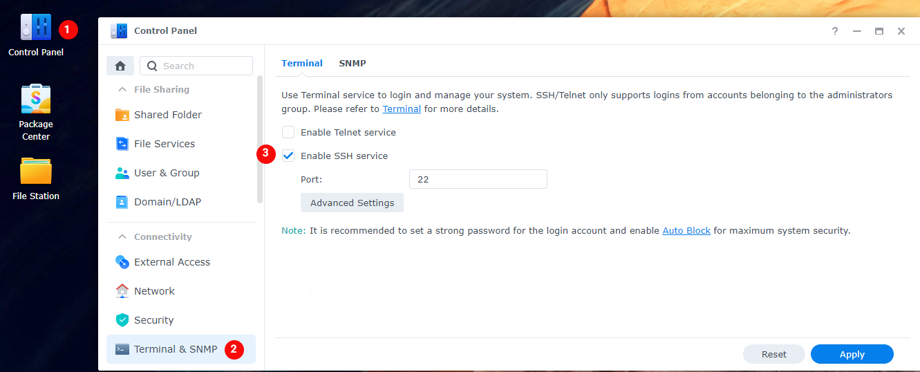 Control Panel > Terminal & SNMP > Enable SSH service